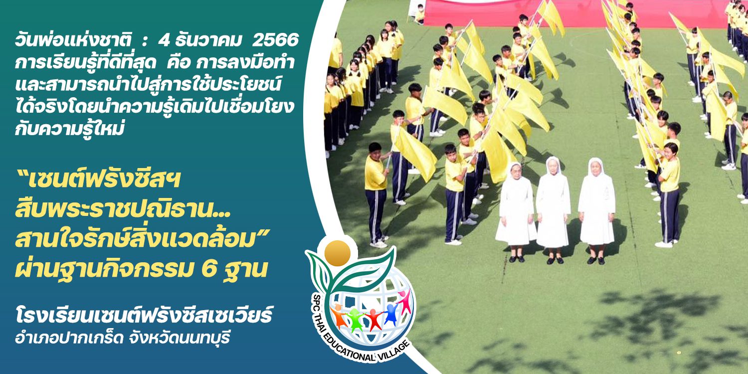 ในวันพ่อแห่งชาติปีนี้ นับเป็นการเรียนรู้ที่ยิ่งใหญ่ คือการเรียนรู้ศาสตร์ของพระราชา ภายใต้กิจกรรม “เซนต์ฟรังซีสฯ สืบพระราชปณิธาน…สานใจรักษ์สิ่งแวดล้อม” เพื่อสร้างประสบการณ์ใหม่ที่ดีในการเรียนรู้ผ่านการลงมือทำ ซึ่งทำให้เด็กๆ ได้สนุกกับการเรียนรู้…รู้จักแก้ปัญหา พร้อมทั้งมีความภาคภูมิใจที่ได้เกิดเป็นคนไทย เพื่อจะได้เป็นผู้สืบสานพระราชปณิธานในการอนุรักษ์สิ่งแวดล้อมให้คงอยู่ตลอดไป